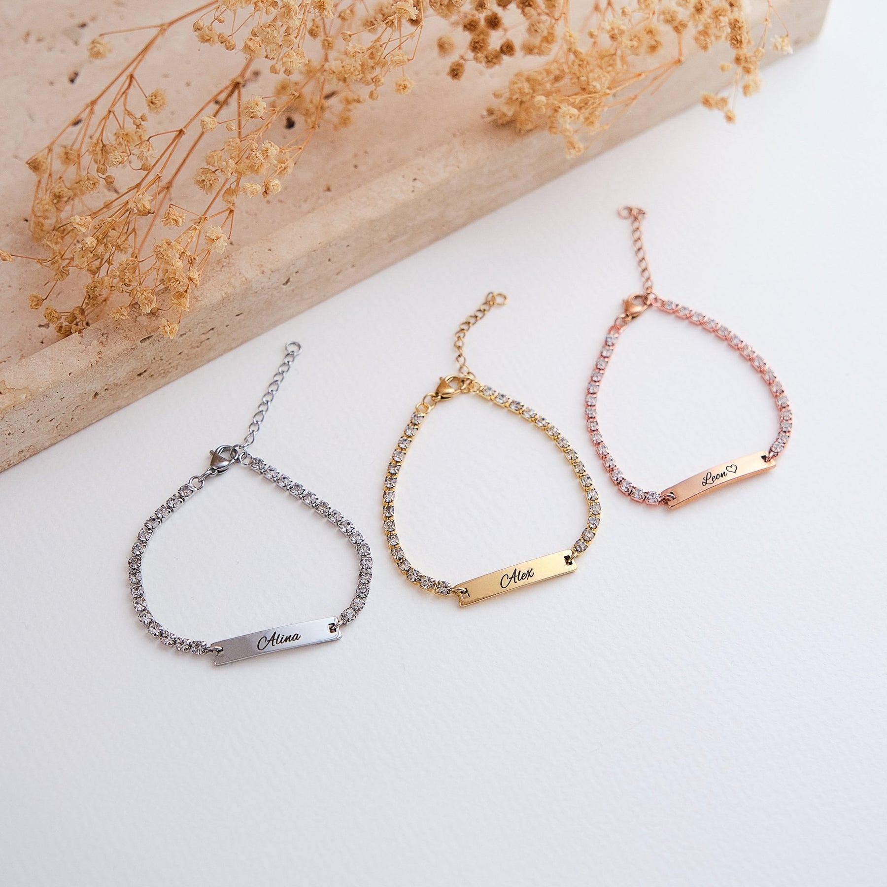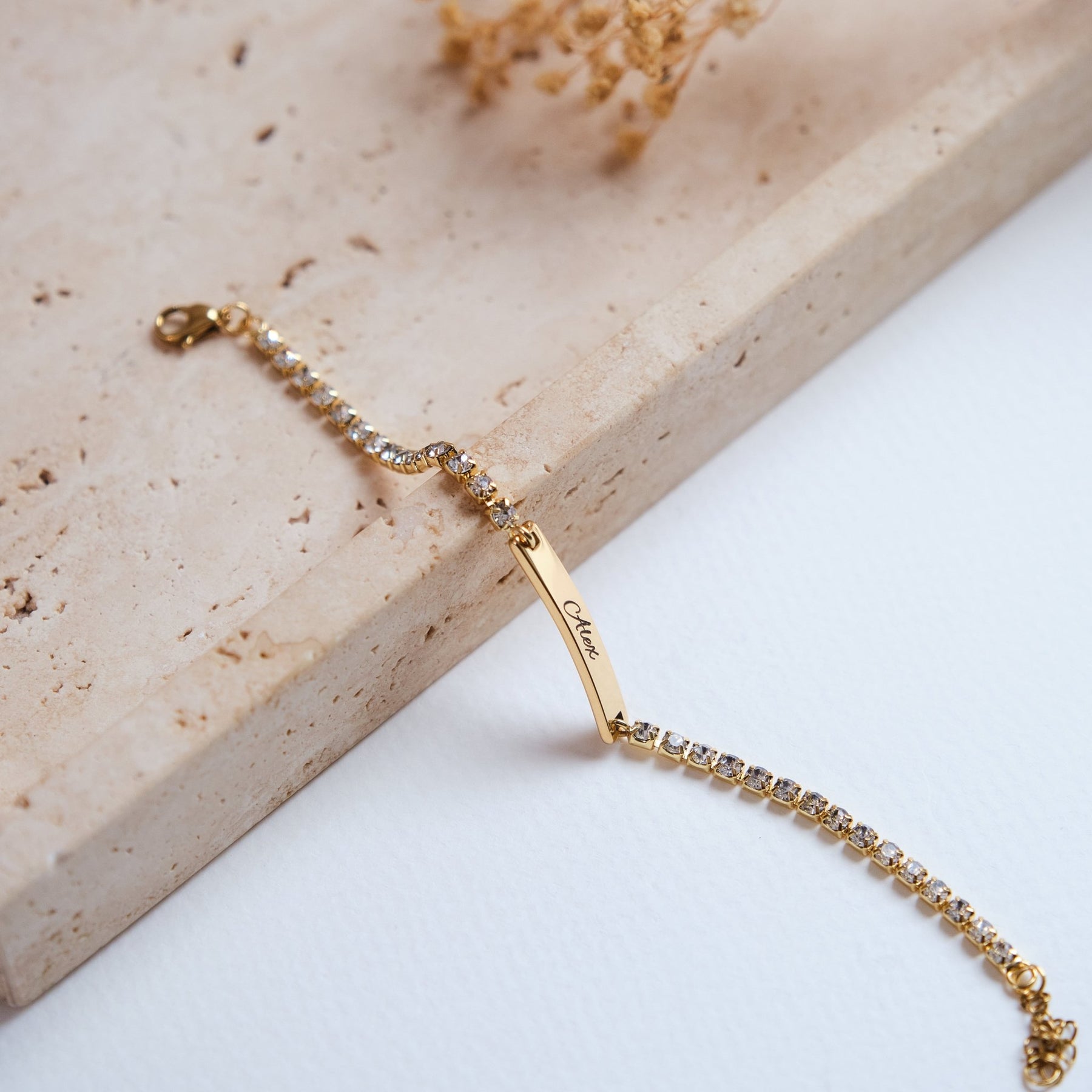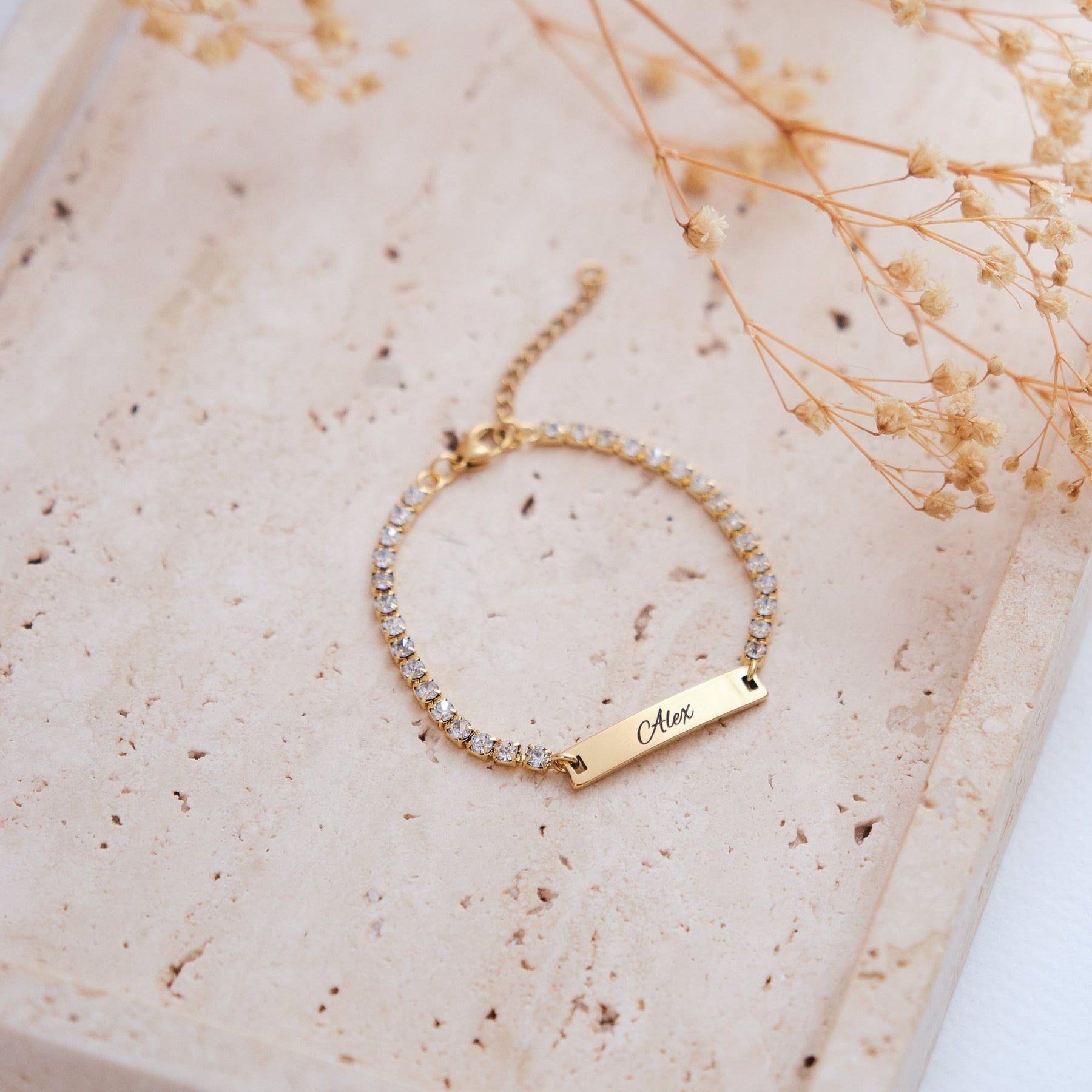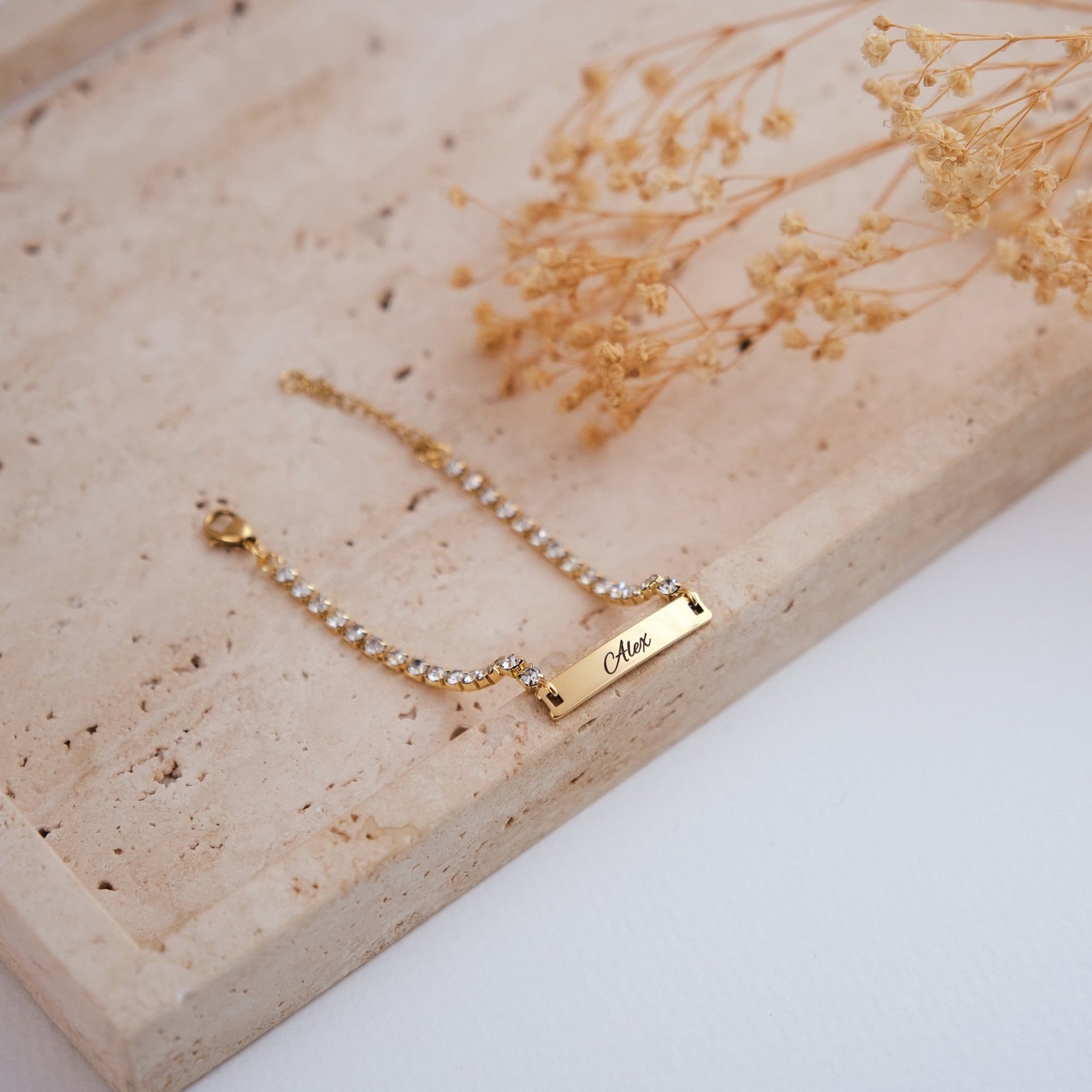 Dieses elegante Armband kombiniert eine schlichte Gravurplatte mit einer funkelnden Gliederkette. Gefertigt aus hochwertigem 316L Edelstahl bleibt es farbbeständig, wasserfest und langlebig. Die goldene IP-Beschichtung sorgt für einen warmen Glanz, der sich perfekt mit jedem Outfit kombinieren lässt.