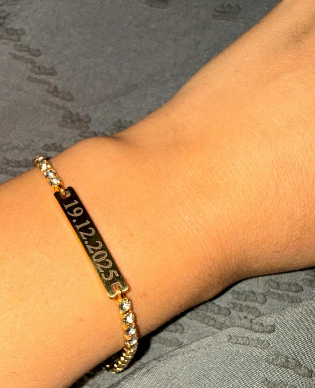 Deze elegante armband combineert een eenvoudige gravureplaat met een fonkelende schakelketting. Gemaakt van hoogwaardig 316L roestvrij staal blijft hij kleurvast, waterbestendig en duurzaam. De gouden IP-coating zorgt voor een warme glans die perfect te combineren is met elke outfit.